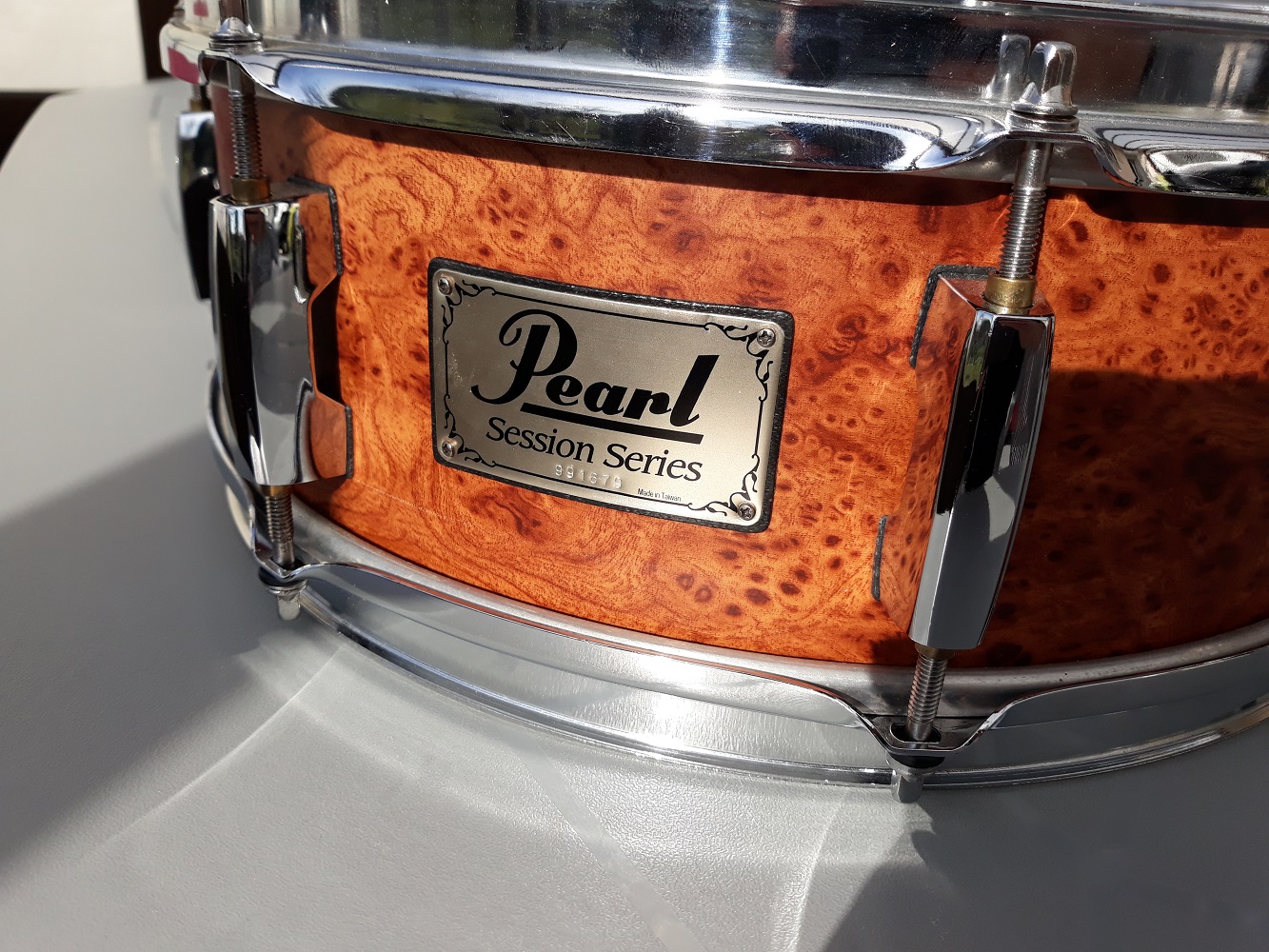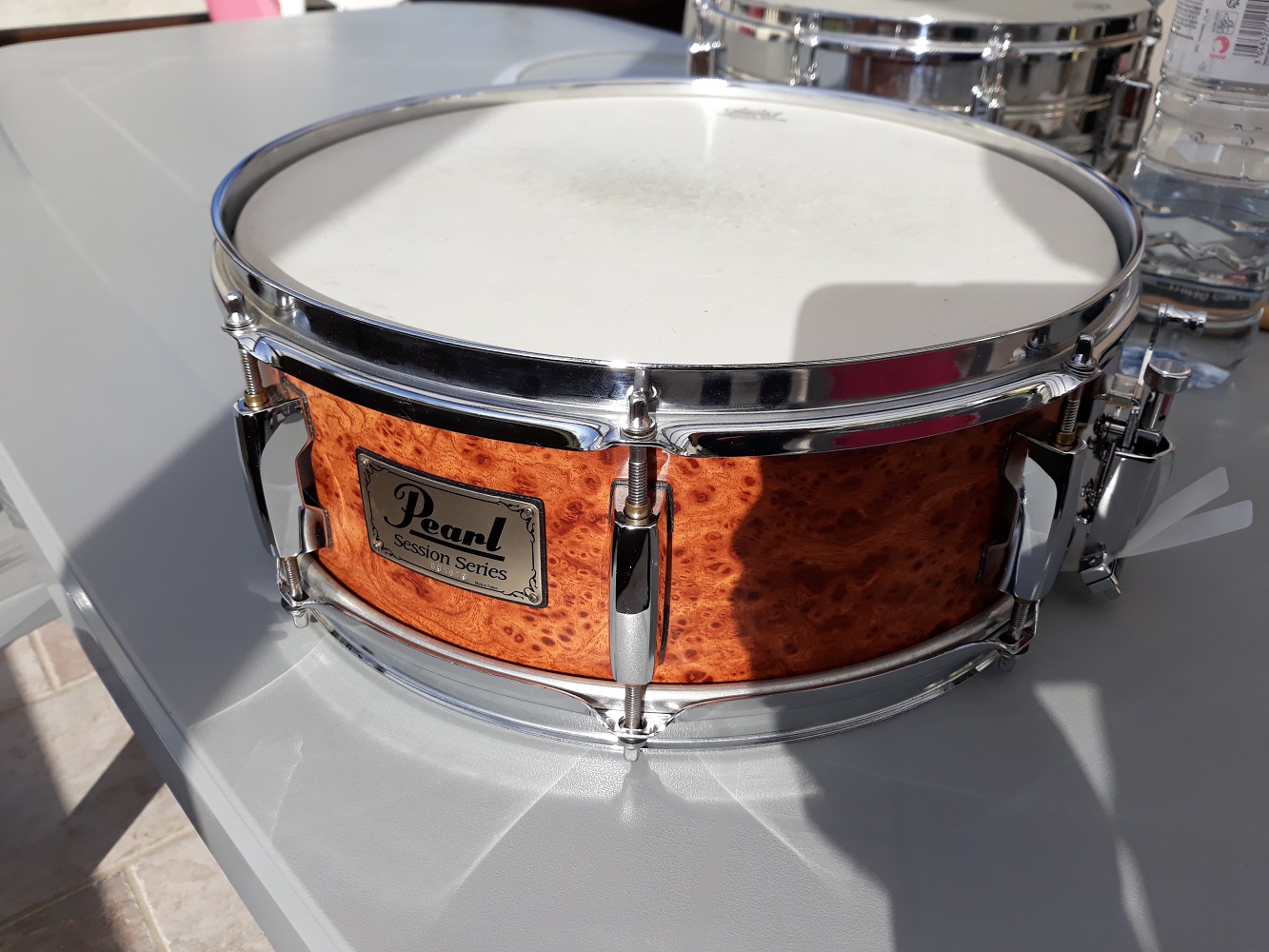 Une Session series 14x5,5" en finition dark burlwood, un mélange d'érable et d'acajou asiatique datant de 1997. J'ai changé le déclencheur par un gibraltar, car le précédent vaillamment réparé par Soft, est allé sur une Pearl Steel chrome (dont je n'ai pas de photos) dont le déclencheur avait lâché au même endroit