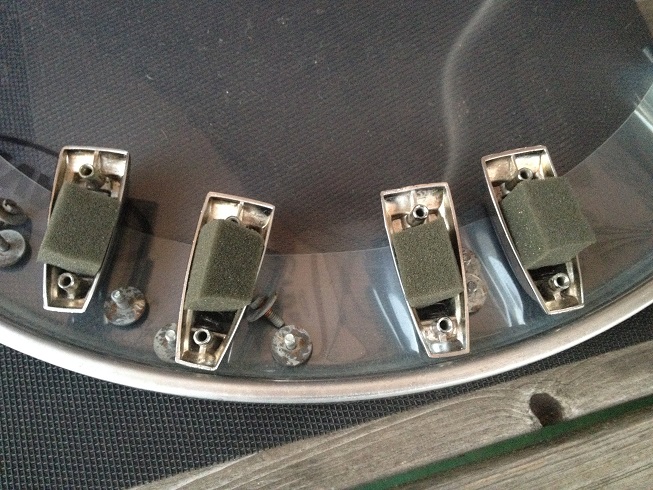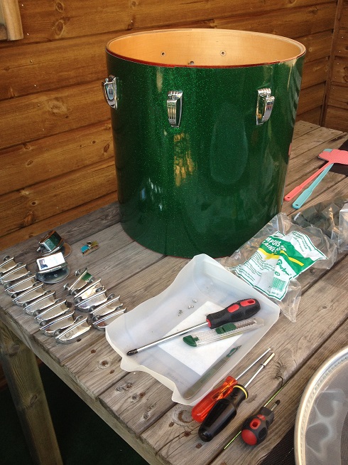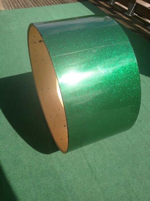 Le 16"x16" en cours de montage, le plus chaud étant de percer les trous pour les coqilles à cause de l'élasticité du wrap : Un p'tit peu de mousse dans les coquilles mais grosse erreur d'après le voisin basque car avec le temps grosse polymerisation en une colle noire gluante... Bon c'est trop tard et vraiment pas le courage de tout virer Le 14"x10" de l'ami DeWasser en cours de finition, j'ai suivi les conseils de Boom pour le remontage des badges (écrous/contre-écrous): Quelques gros plans de coquilles vissées sur le wrap :