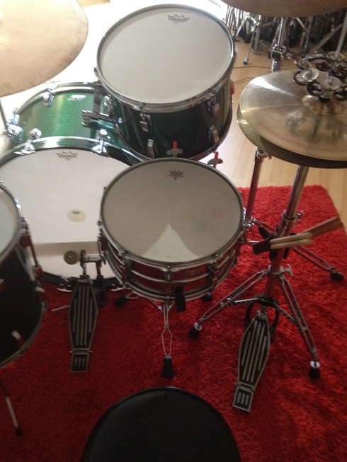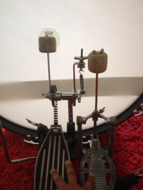 Les basseux 16" & 18" en position ! Test de pédale de GC : Loud Speed King (en prêt sympathique du Boom) et une Sonor Signature Horst Link On sent bien la lourdeur germanique écrasant la souple & fluide ricaine... Je cherchais une pédale qui me permette d'avoir la batte le plus près du centre de la 26", en remontant la potence de la Sonor au maxi j'y parviens presque, la SK réglée au maxi est plus basse de 5 bon cm: Vue du poste de commandement :
