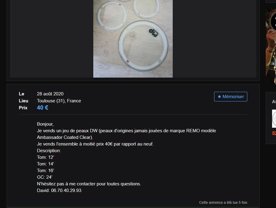 La Drummerie se réserve le droit de demander des explications ou justificatifs à tout annonceur sur les aspects conformité / légalité de son offre, sans que cela ne constitue pour quelque membre du forum une quelconque "garantie". Nous n'exerçons qu'un contrôle "de principe". La responsabilité de La Drummerie ne pourra être engagée en cas de dol, duperie ou litige entre membres.