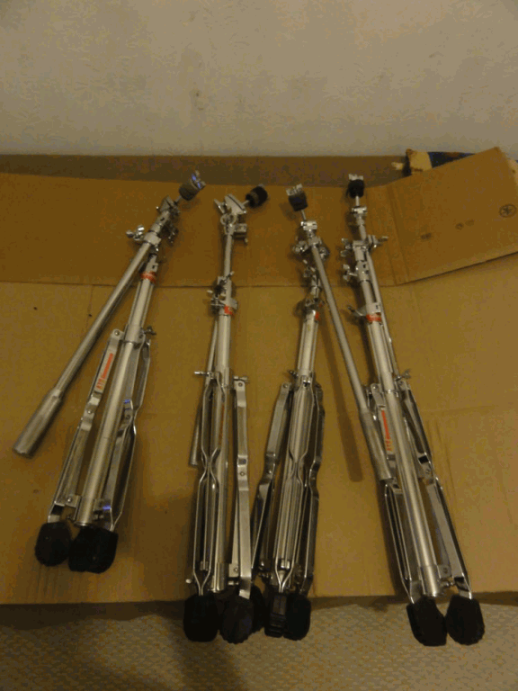 Ici on commence avec du ATS, hdg des 90's, achetés à Lovesupreme il y a quelques années. Je l'ai transporté une dizaine de fois, et je vous préviens, c'est lourd... et donc aucun souci pour la chute des cymbales et le réglage tip top moumoute. C'est aussi absolument modulable à souhait, jusqu'à la hauteur des pieds indépendamment les uns des autres, ce qui permet d'ajouter une "dimension" dans le placement et de s'adapter au différent sol. Je les vends car j'ai acheté des flatbase à Jb et que je préfère les pieds droits. Je vous copie le txt de l'époque de lovesupreme qui est très précis :