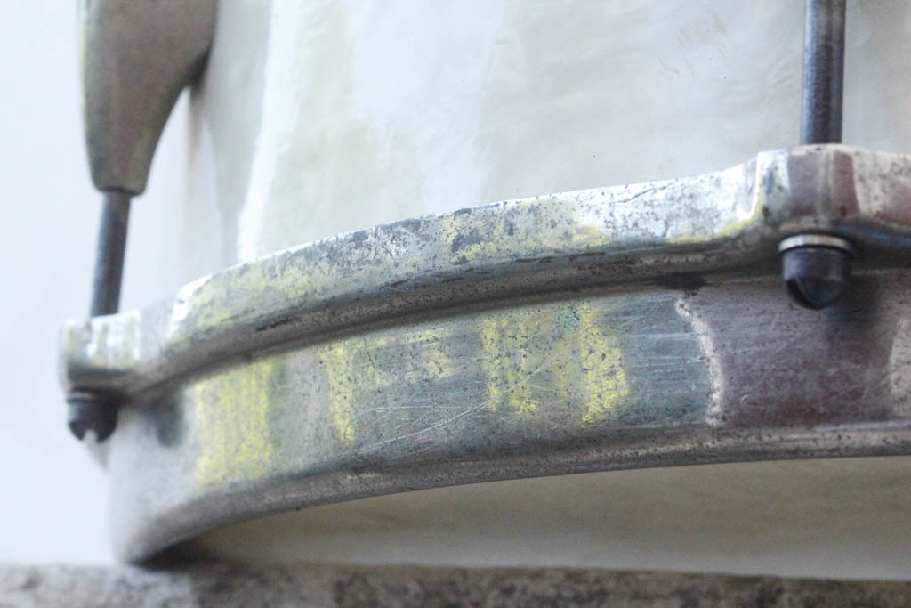 ça y est elle est là ! sous mes yeux ... belle mais ... quelque peu malmenée. Je vous préviens ne vous attendez pas à du david copperfield , je ne suis ni vintage ni soft ni pirla vavou et autres dingos du champignon que j'oublie qu'ils m'en excusent . On va se contenter de sauver les meubles, remettre en état de sonner et basta . Peaux métriques avec du veau en haut et une curieuse tentative de passer une diplomat haze de 14" a base de sciage de cercle dessous, avec timbre japan roti ... abominable ! Je tape dessus ça fait un boiiing ignoble ... ça part bien ! j'ai pris quelques détails croustillants en photo. Les bonnes surprises sont peu nombreuses mais porteuses d'espoir. Mis à part le timbre elle est complète. les cercles et le fut sont en bon état et la facture globale me fait dire que j'ai quand même pas mis la main sur une bouse va falloir se la mériter !