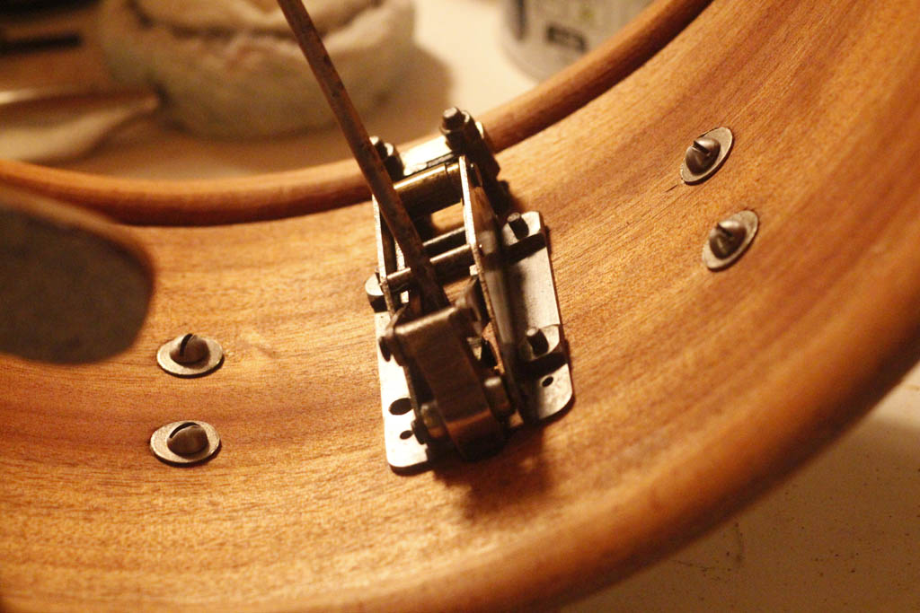 - Heureusement que c'est pas rouillé ! Dans ma chance inouie je me rends compte que le boulot est presque fini ... elle a déjà été "restaurée" ! (le gars est "magasin de musique" quand même) en même temps qu'il montait la diplomat il a noté un curieux défaut de planeité du fut a l'endroit du timbre ... ça bossait comme des sagouins chez metjazz ! alors hop ! un peu de pâte à bois et voilà ! Surout que le gars est une sorte de boticcelli du synthobois j'ai failli pas le voir ! le chanfrein est curieux avec appui sur le premier pli interieur juste apres le renfrein . Fut épais plis du milieu conséquent qualité des bois waou et odeur sympatique de colle à l'os . J'attaque la bête