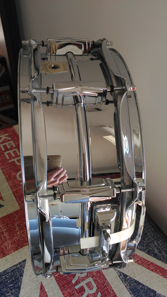 la peau de frappe est jouée mais même pas creusée, la caisse elle-même est une Monroe d'une dizaine d'année, première main d'un batteur hyper soigneux mort à peine un an après l'achat. elle est vraiment comme neuve et stockée dans des conditions optimales; Thomann en demande 689€ sans housse; pour 550€, dans sa housse (état neuf) elle est à vous.