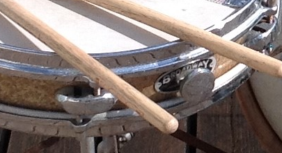 Oui, dommage, effectivement. La peau (chèvre?) avait été percée (autour des années 80). Les magasins de musique visités n'ayant pas les peaux ni les dimensions d'origine, la batterie a donc été équipée avec un set standard.