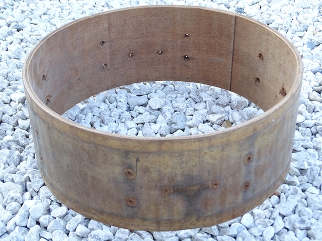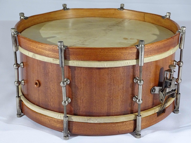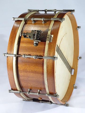 Non ce n'est pas du 14"... Une dimension particulière "à la française", et en l'occurrence un petit fût de 31,5 x 12 cm, soit 12,4" x 4,75"... Fût constitué de 3 plis cintrés à la vapeur (A. Cirichelli en avait déposé le brevet en 1926), avec des chanfreins à 30°... Le placage a retrouvé son éclat, et je ne sais pas si c'est du noyer Morna... Peaux naturelle Mr T, dans les années 30 le père Evans n'avait rien encore inventé...