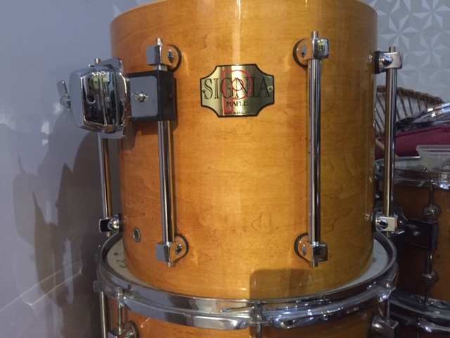 Or je suis tombé sur une annonce pour un kit Premier Signia Maple en 20/10/12/14/16 (je cherchais justement un kit avec une grosse caisse de 20) à un prix qui m'a semblé intéressant compte tenu de tout ce qui était fourni avec (micros, housse, cymbales, cloches, hardware, et une caisse claire ludwig en érable qui a une sacré patate). La batterie date de 1994, elle a vécu mais est plutôt en bon état pour une batterie qui a été utilisée par un pro qui faisait pas mal de bal. En fait elle n'a aucune marque de choc, elle est par contre très sale et les chromes sont un peu piqués par endroits, sur les cercles et les tirants. Le bois est nickel. Les renforts de chanfreins ne se décollent pas (j'ai lu que ça pouvait arriver sur ce modèle). Et voilà, je l'ai achetée.