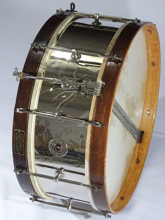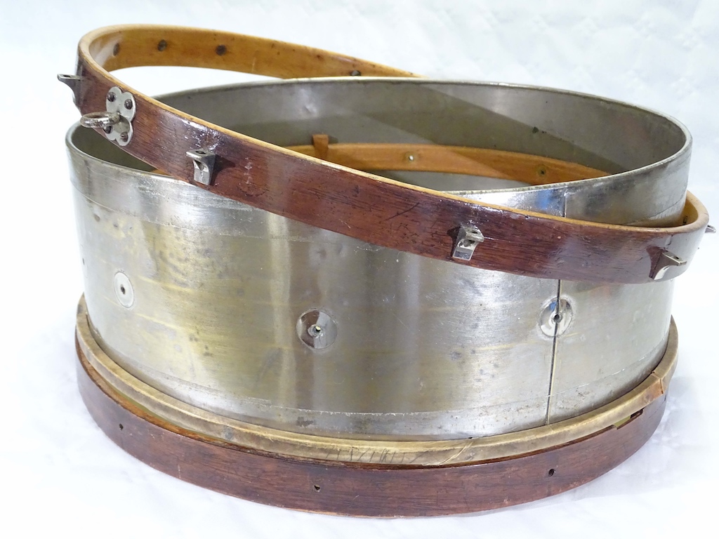 Arrivée démontée, le nickelage ayant subit quelques outrages abrasifs, elle devait retrouver sa beauté d'antan... De plus, quelques tirants disparus, un tire timbre et son support en partie perdu, bref, une très belle restauration pour cette caisse claire DUPLEX de parade de 15"...