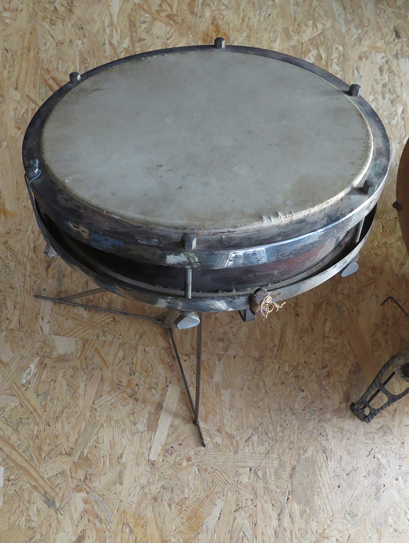 Pour poursuivre, la grosse caisse est probablement une 20 pouces (je mesure un peu plus de 52 cm,mais bon) avec peau animal sur chaque face, profondeur 18, 5 cm (7 pouces ?), avec 6 tirants.