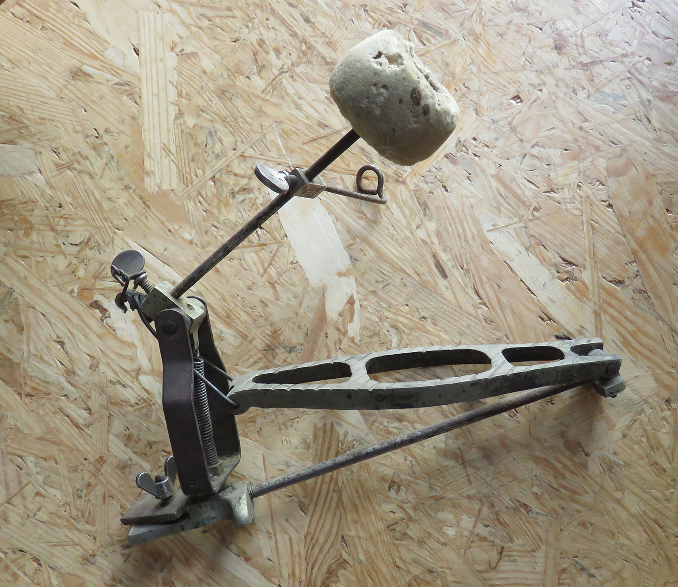 Sur la batte de la pédale, une tige supplémentaire vient frapper une autre cymbale que l'on peut plaquer sur la peau de frappe de la grosse caisse.