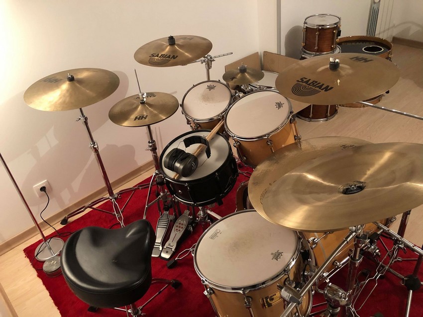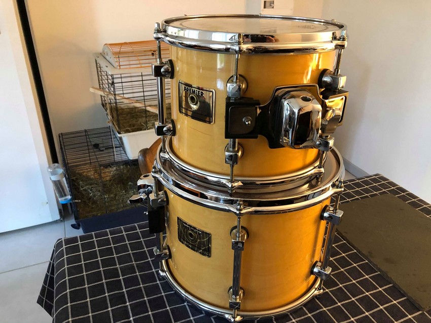 Il y a quelques mois j'ai décidé de me racheter une Premier Signia Maple après avoir remarqué que leurs tarifs avaient bien chuté. Je mets la main sur un très beau kit Walnut en 10-12-14-20x16, grosse caisse non percée, dans le sud de la France. Je retrouve avec bonheur ces fûts chantants, à la sonorité chaleureuse, à la limite du vintage. 5 plis d'érable, épaisseur 5 mm, des renforts de chanfreins en hêtre, des cercles emboutis de très bonne facture. Même si le hardware a pris un coup de vieux, quel pied !