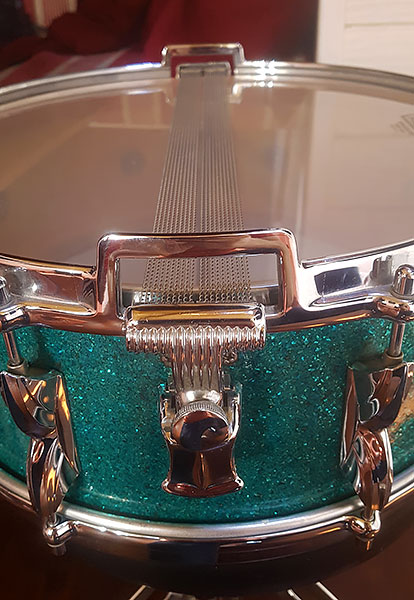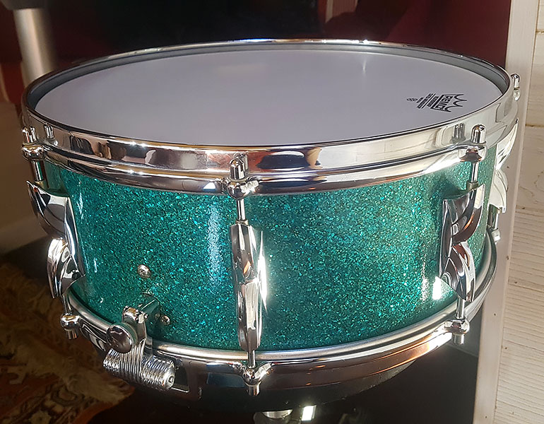 Une caisse claire Royale-Ace 14x5,5 couleur Aquamarine. Probablement de 1967 ou 1968, période transitoire, avec la nouvelle génération de coquilles mais l’ancien badge et design de déclencheur parallèle.