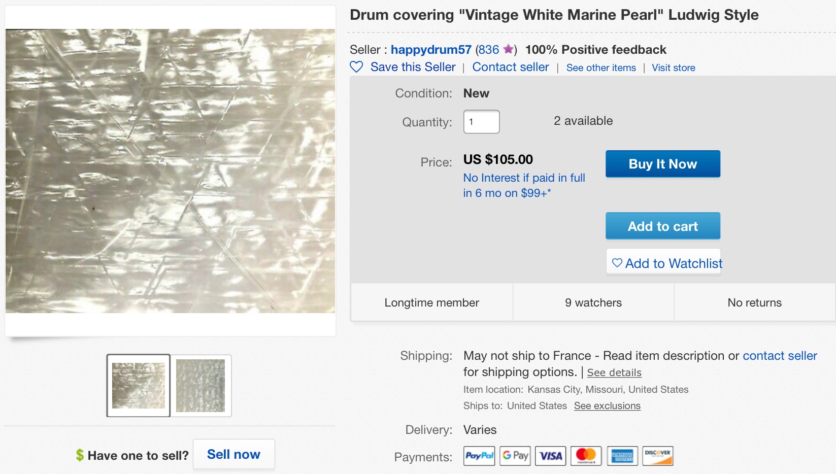 Et pis aussi, mais alors là, long shot comme on dit,, il me faudrait un bout de wrap white Marine Pearl, mais Ludwig (en « V ») et et vieux. Une récup d’un desossage / recoverage quoi.