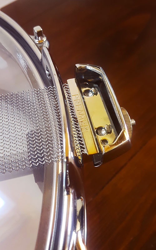 on apprend que "For many years Premier’s hoops were cast from a zinc alloy called mazak, until the ’70s when they were changed to pressed-steel with triple-flanges"