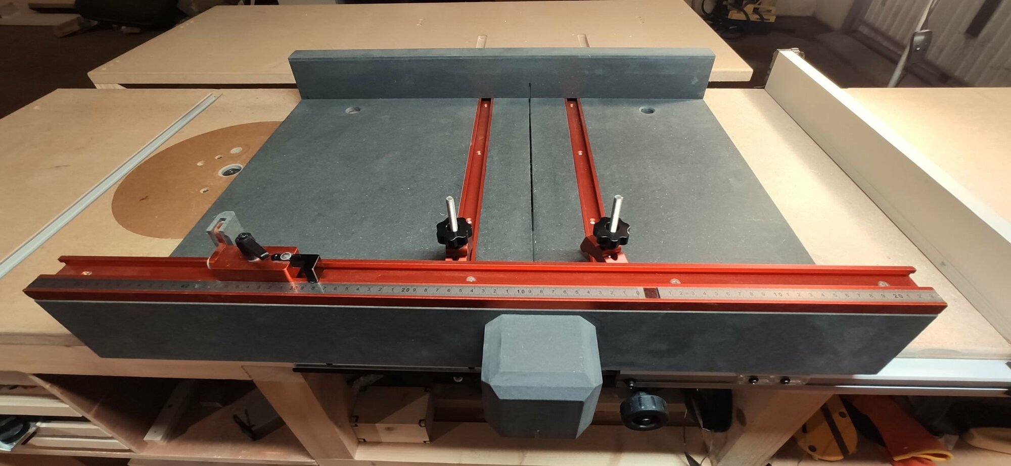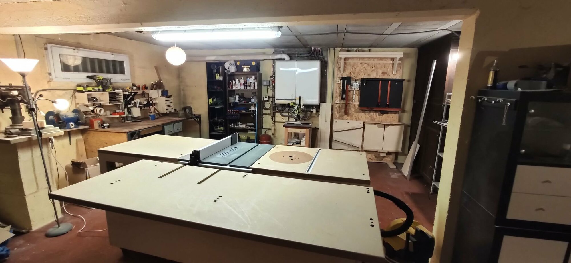 Côté combiné custom, une table de sortie fait son apparition, qui a pour avantage de ne plus m'obliger à me pencher au dessus de scie pour empêcher du bout des bras les grands panneaux de tomber au sol. Un plus.
