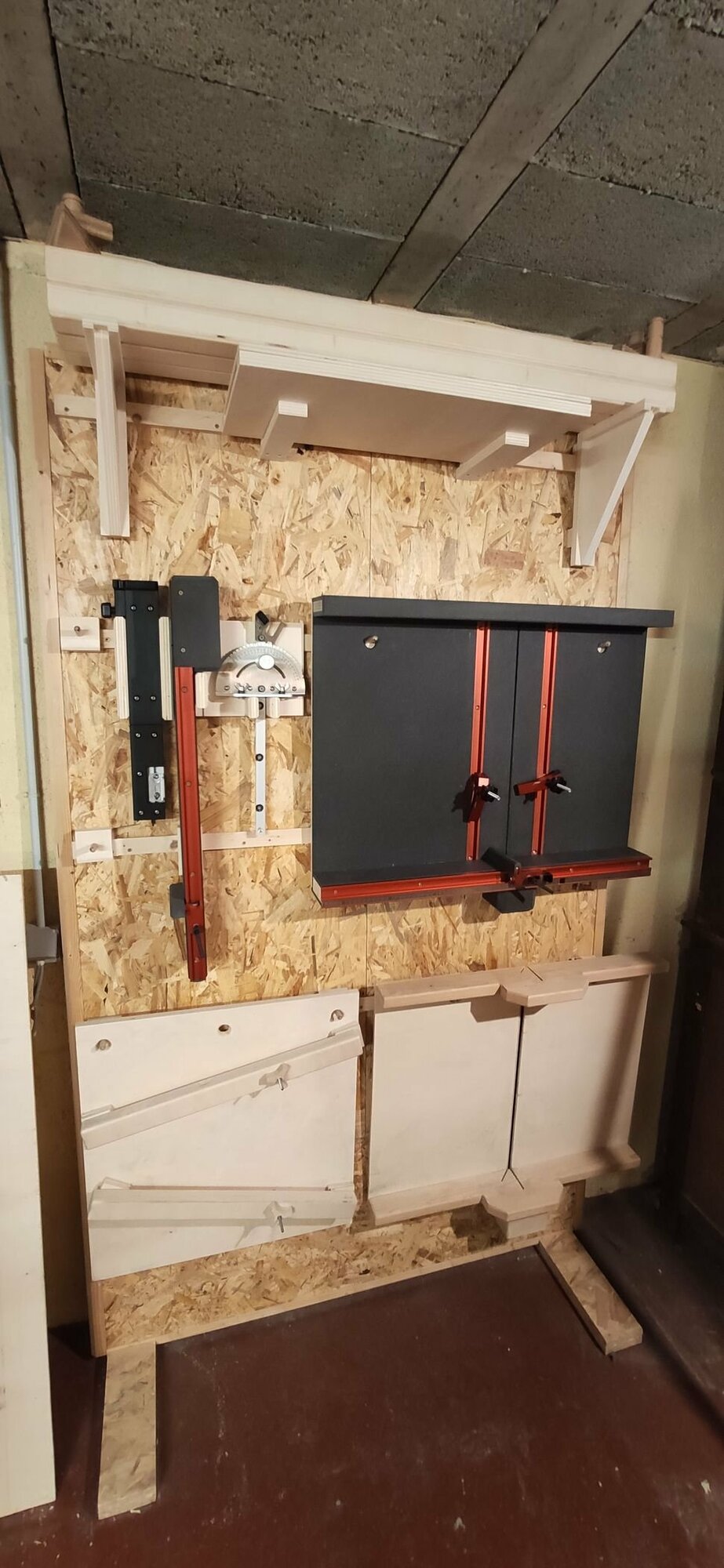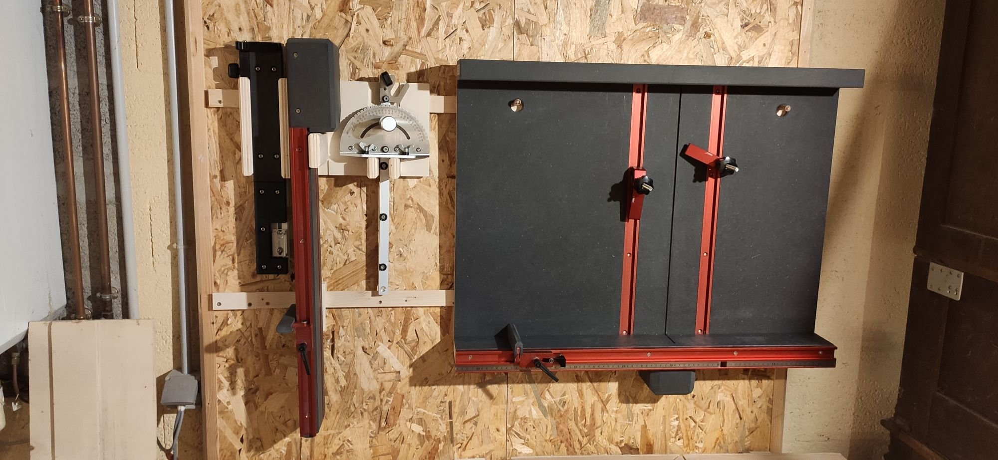 Depuis l'année dernière j'ai commencé un système de taquets français (French Cleats pour YoutTube). C'est vraiment pratique, et le jour où j'ai ma maison y'a plus qu'à mettre OSB et rails aux murs et c'est parti.