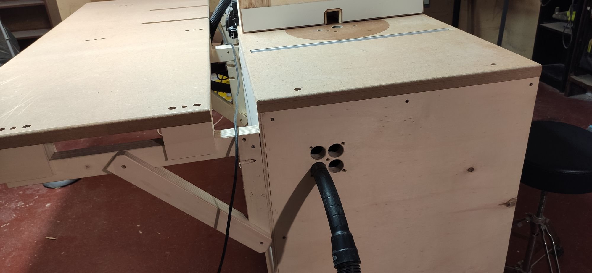 On le voit un peu au dessus, j'ai ajouté de quoi brancher la scie, la défonceuse (dessus/dessous) et un éventuel futur outil sur l'aspirateur depuis le côté. L'aspirateur est un peu juste, faut pas trop faire l'andouille si l'on ne veut pas boucher les tuyaux (allumer la scie sans allumer l'aspi par exemple :roll: ), mais ça fait la blague en attendant le jour lointain où j'aurai une aspiration centralisée avec un cyclone. C'est toujours mieux que se plier en 3 ou faire le tour du meuble quand on change de machine. :ouui: