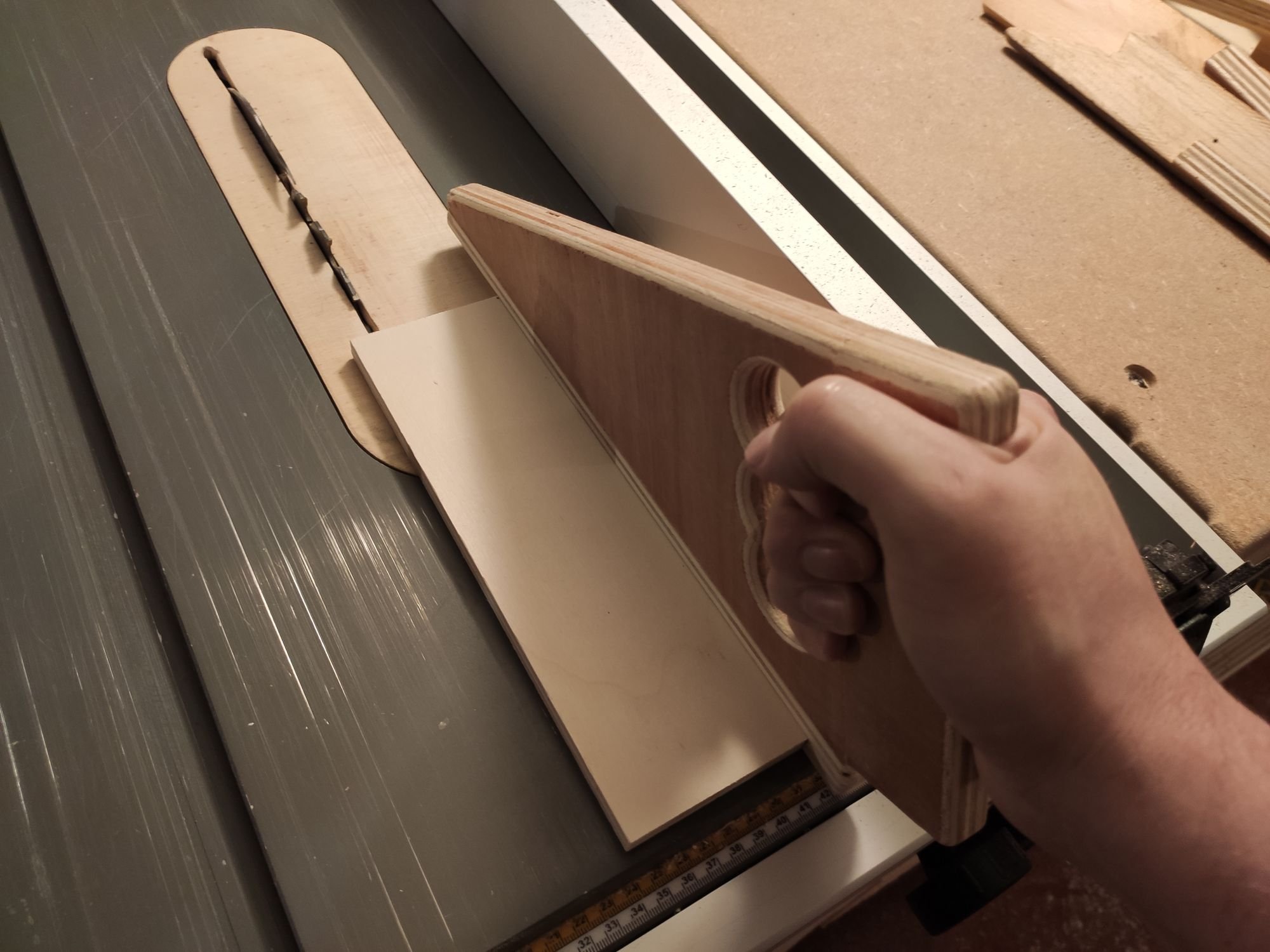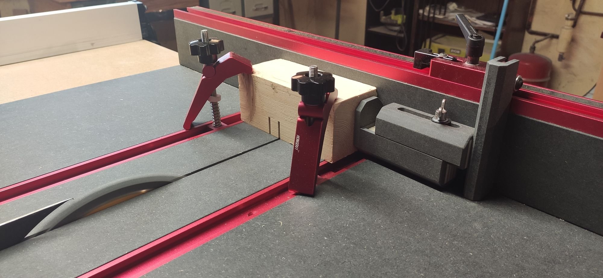 Je mets un coup de scie avec le Kerfmaker© entre la butée et la pièce à découper. Les clamps sont proches de la lames, pas mes doigts. :nop: