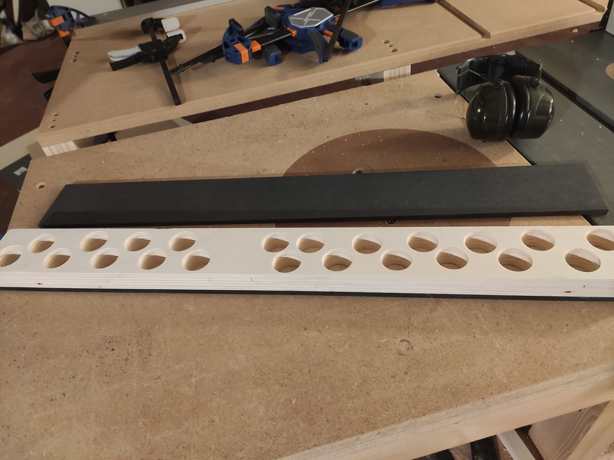 Nouvel insert pour la scie. Plus rigide que l'ancien (merci le Valchromat), il évite les variations de profondeur en fonction de la conviction de l'utilisateur. Les trous supplémentaires sont là pour éviter l'effet "bouchon" et l'asphyxie de l'aspirateur. Idéalement ils devraient être aussi et surtout sur la gauche de la lame, mais la conception de la scie fait que l'insert doit être très fin sur la gauche, et donc déjà pas super rigide. Pas top pour les trous.