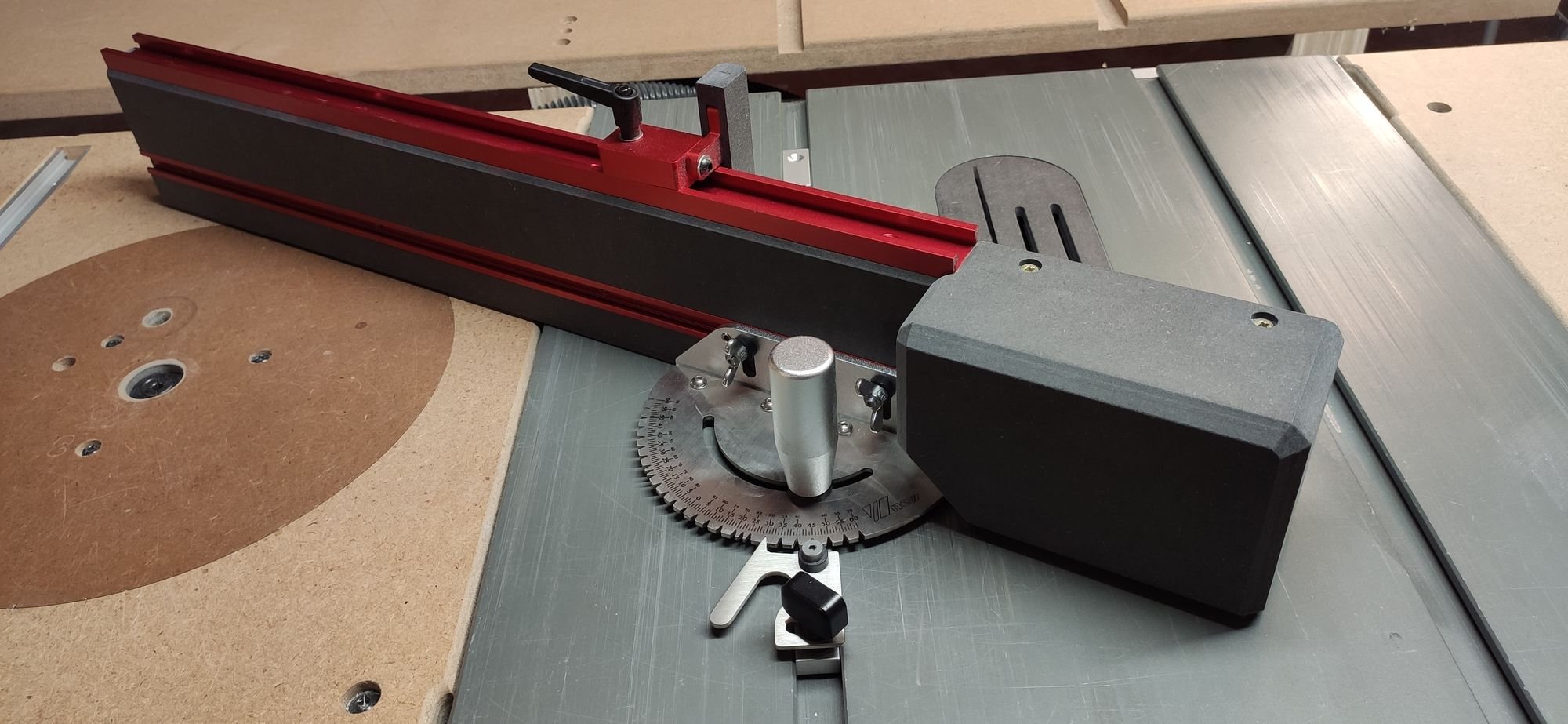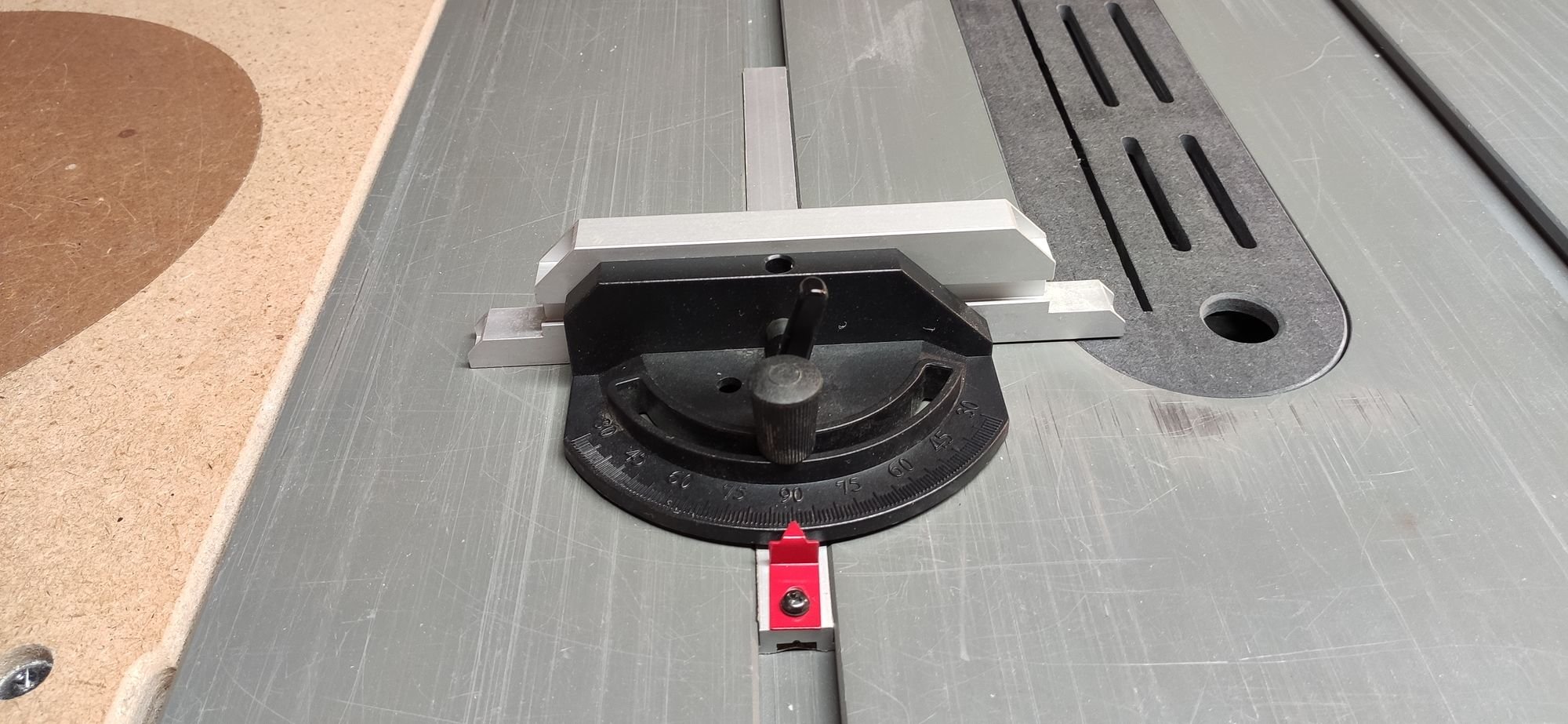 Comme tout guide d'onglet fourni avec une scie qui se respect, le mien était abominable, imprécis et branlant au point d'être dangereux et inutilisable. Avec quelques ajustements de la coulisse et des angles il devenait utilisable en dépannage, mais bon.