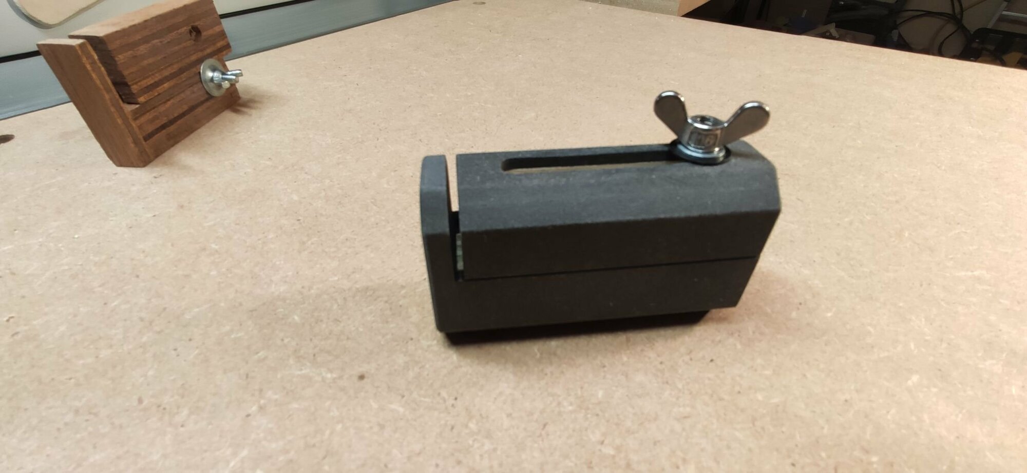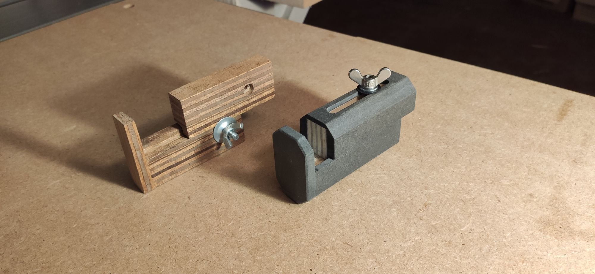 Le nouveau est drôlement plus bien. Je ne sais pas si je vous ai déjà parlé du Valchromat, mais c'est sympa à usiner. La pièce mobile étant traversée par le boulon, elle est solidaire de l'outil. Le papillon étant moins large que le kerfmaker, on peut l'orienter comme on veut sans qu'il nous casse les pieds. :coeur: