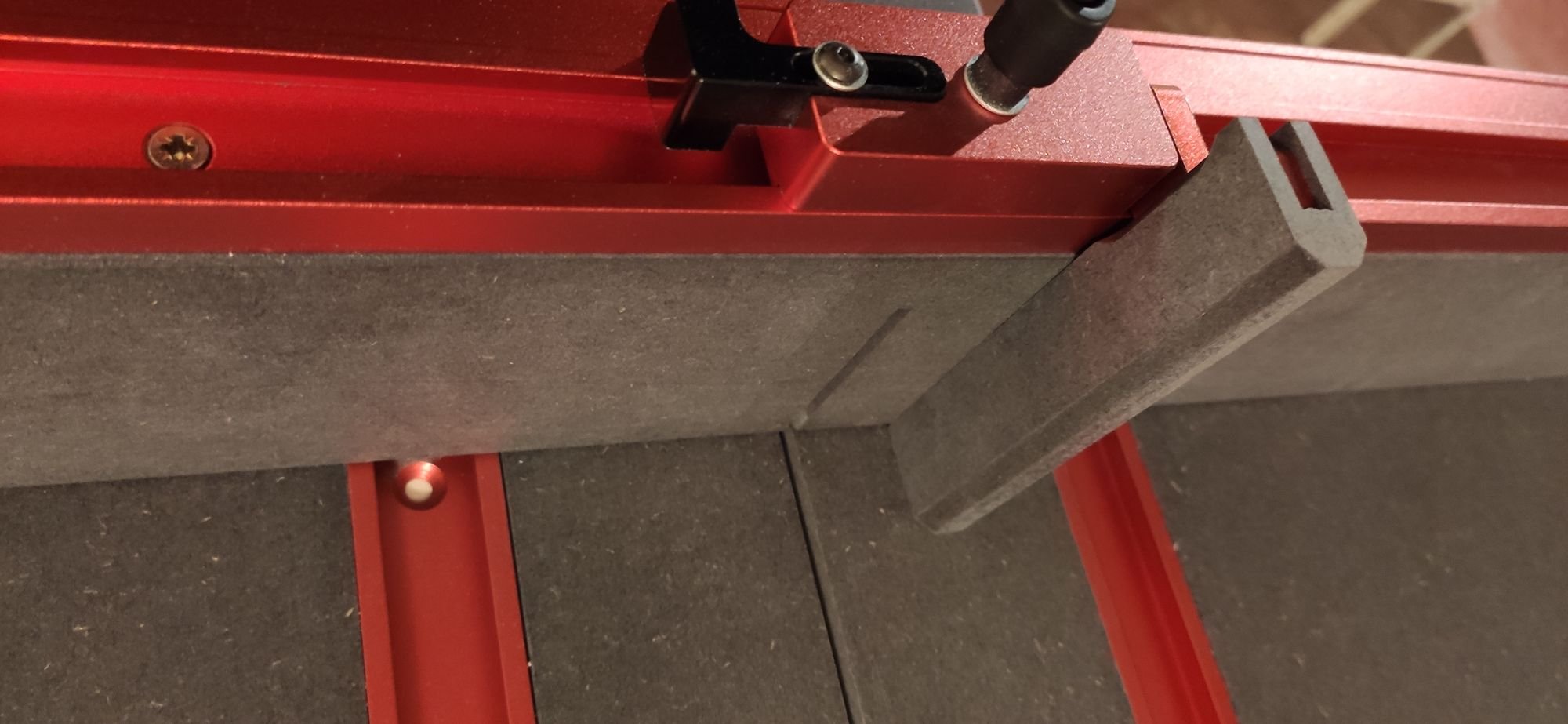 Avec l'aide des gentils lutins d'AliExpress pour les fournitures, voici le nouveau chariot, tout de Valchromat vêtu, affublé de T-tracks, curseur, butée et clamps. Ça change tout côté précision et sécurité. Plus de panneau qui se lève à l'arrivée de la scie.
