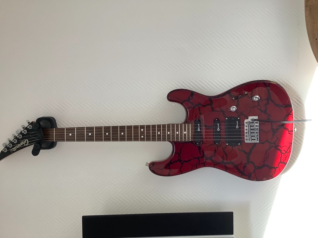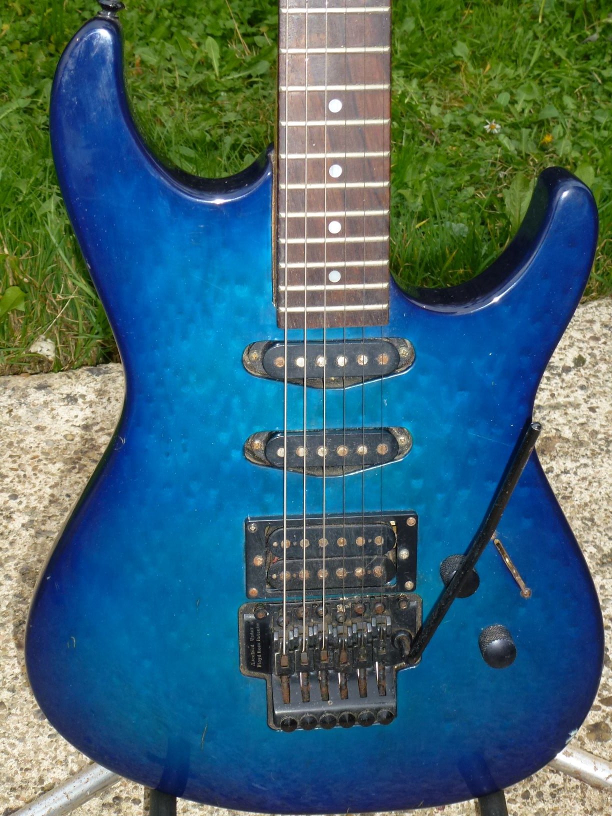 C’est une de ces guitares pointues des 90s, avec un Floyd rose, et beaucoup (trop ?) de gain en sortie.