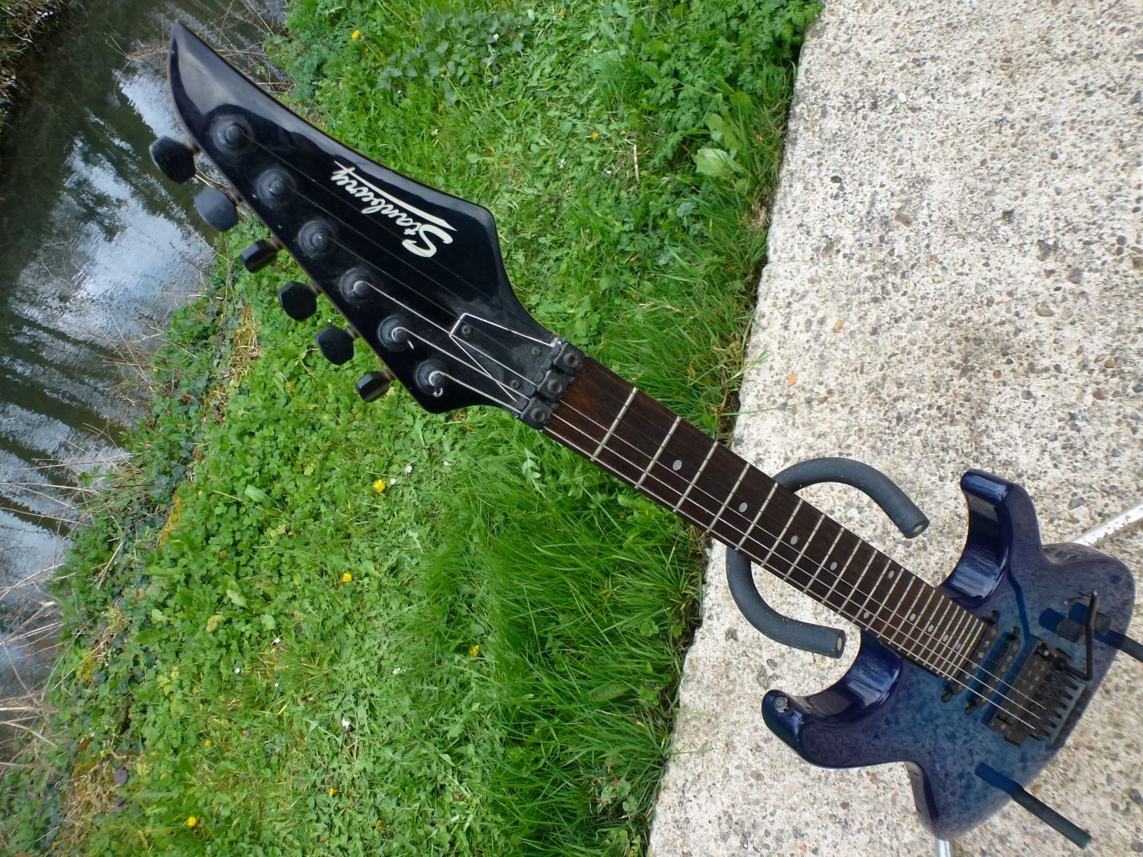 perso j'ai une vague stratoïde "Stanbury" des 90's: marque très inconnue, deux simples un double, sélecteur 5 positions, volume/tonalité, floyd rose, corps aulne, table bird's eye, manche vissé 22 cases rapide type strat 1964, touche palissandre du Calvados, sillet bloquant, mécaniques type Schaller, corps verni dégradé bleu de cobalt, accastillage black chrome,