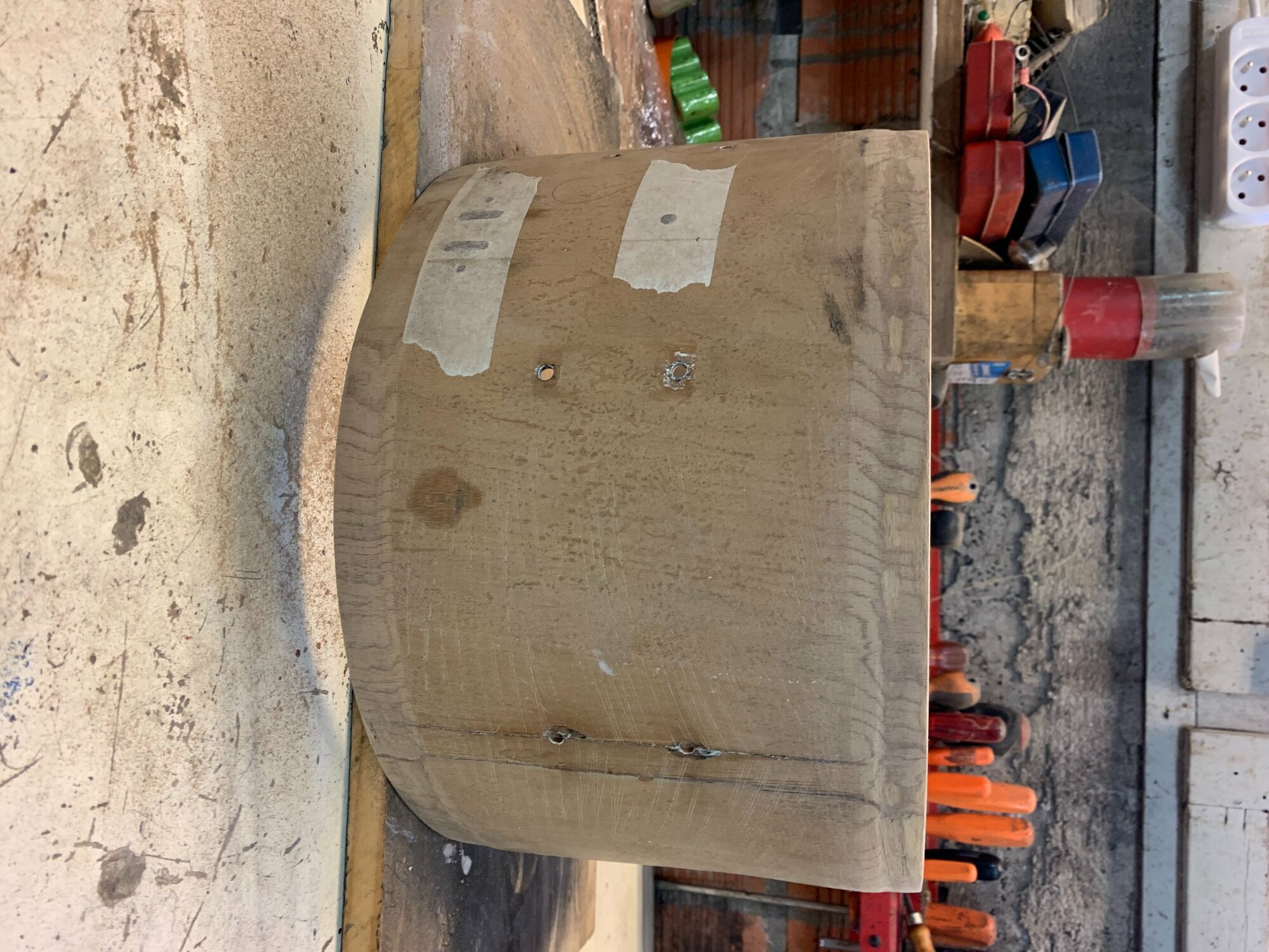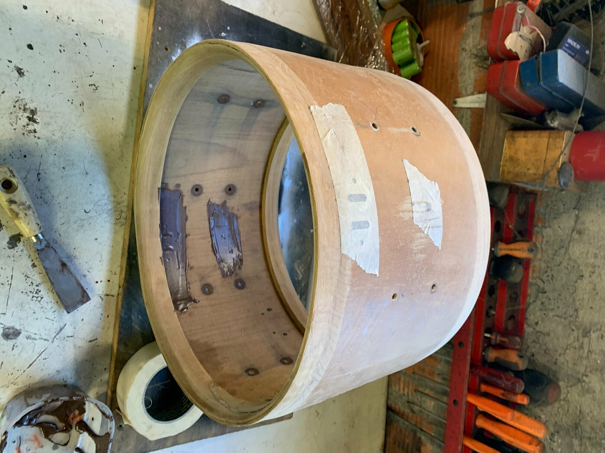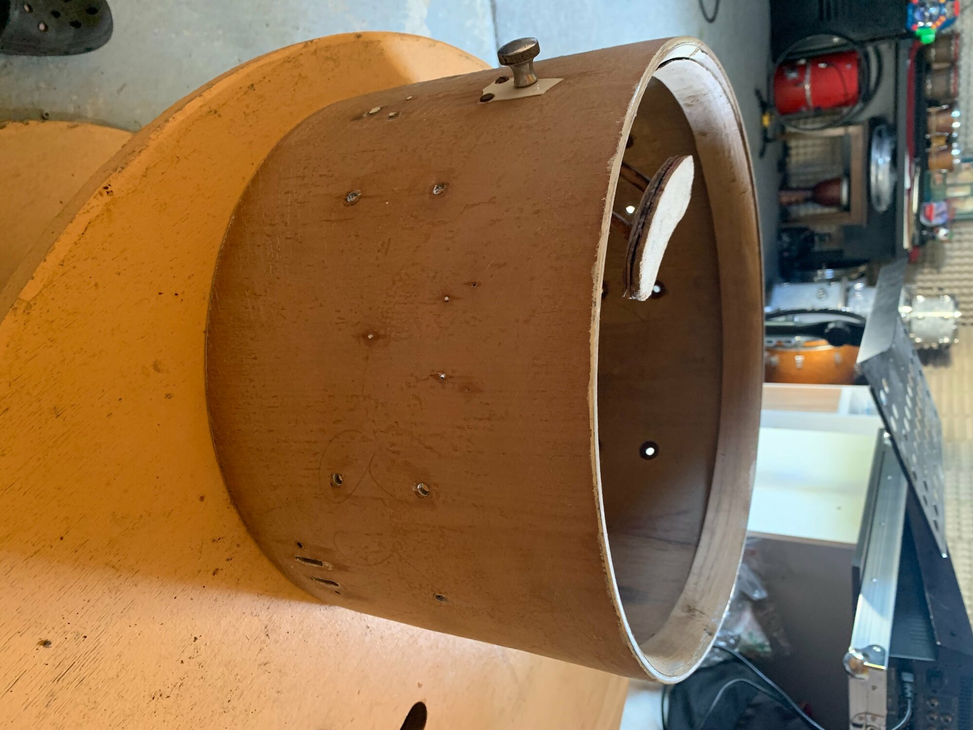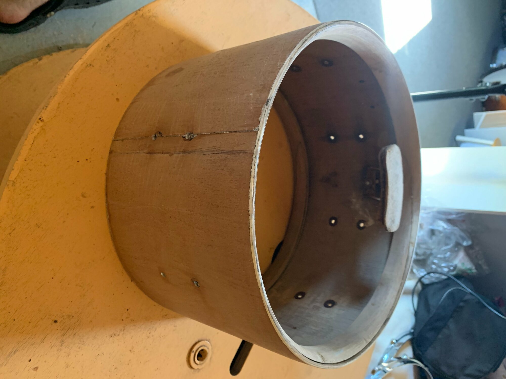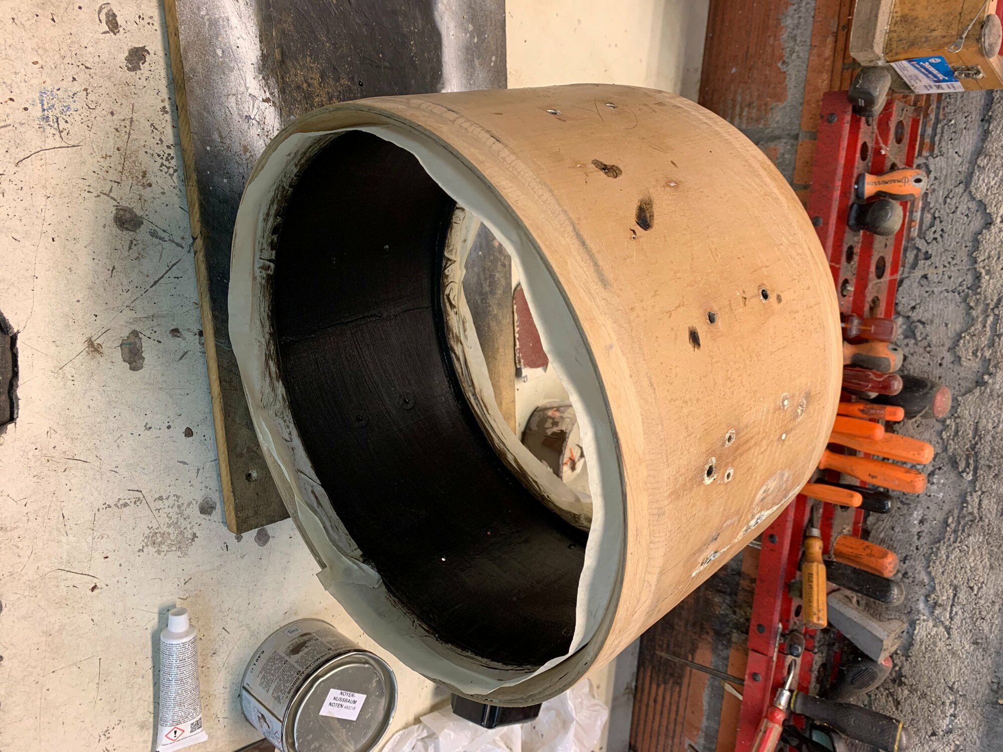 Mon idée serait de la passer en pouce en ponçant les extrémités jusqu'à obtenir un beau 14" bien rond ou une ambassador viendra se glisser aisément. Le fût faisant 36cm de diamètre actuellement, je pense que c'est jouable, certains d'entre vous ont déjà testé?