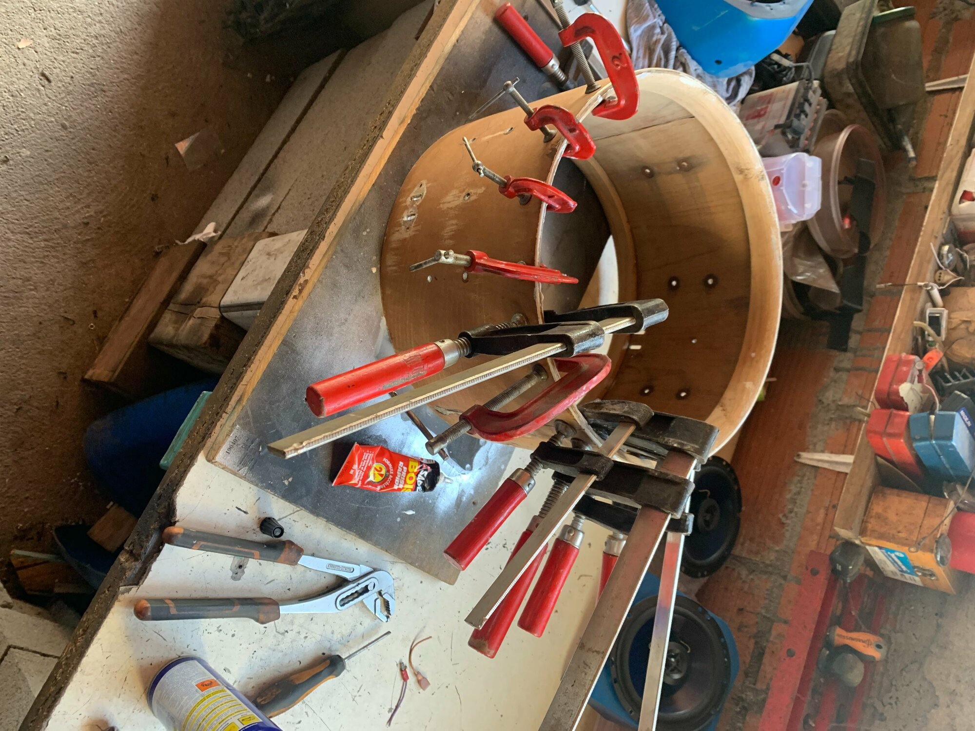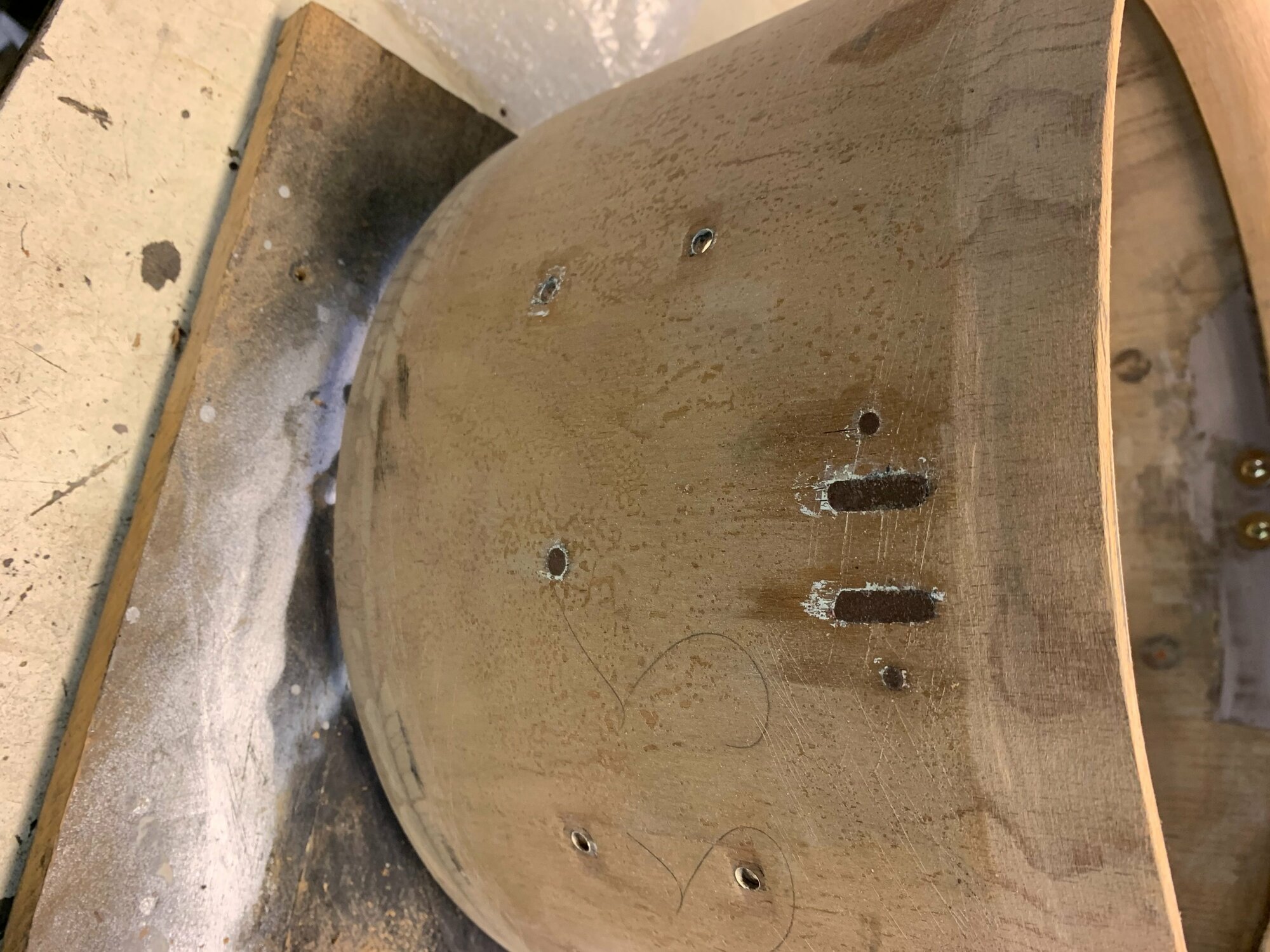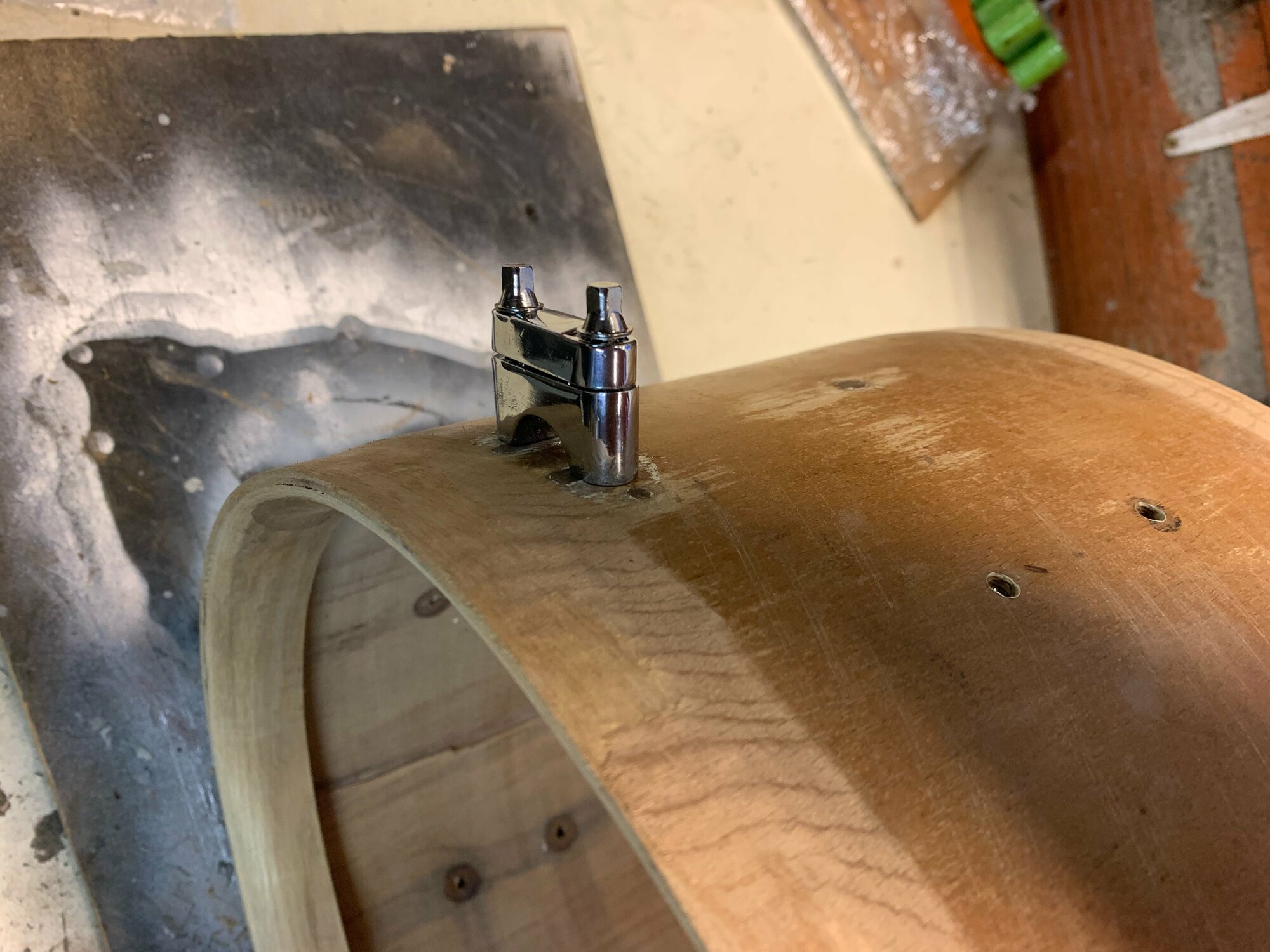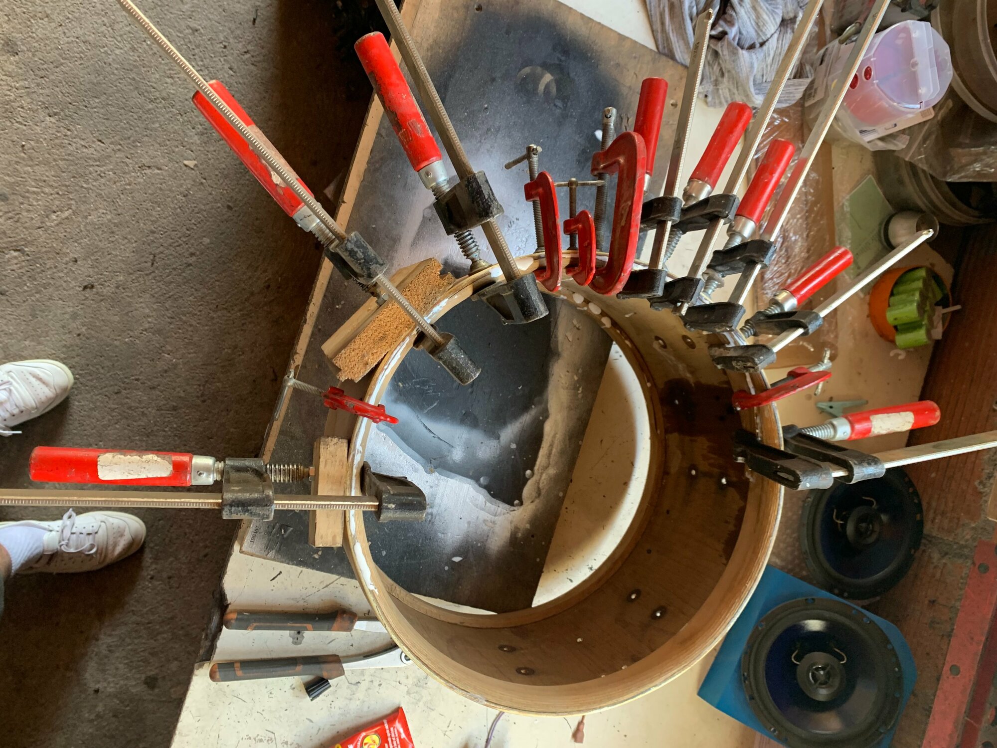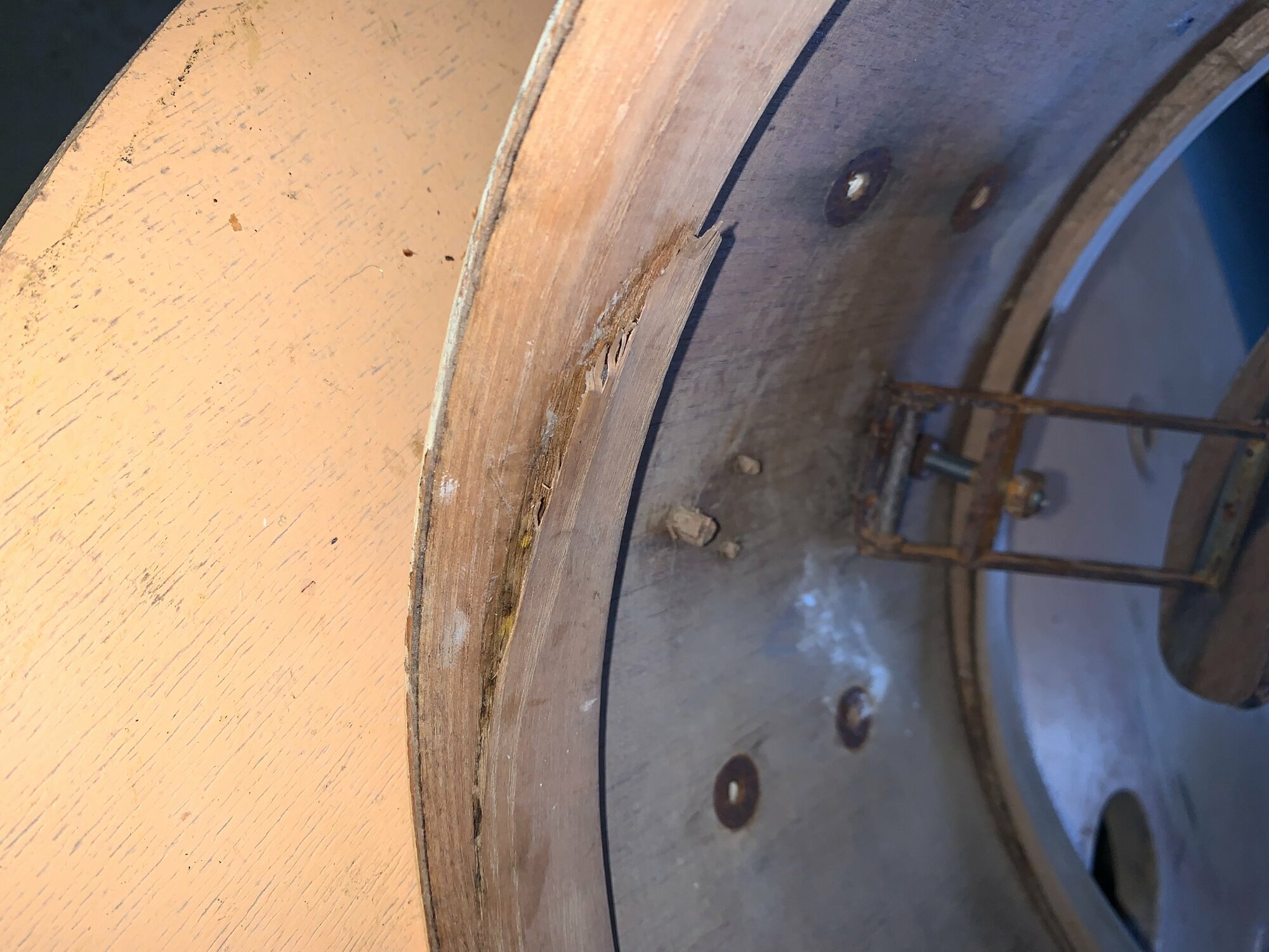 Mon idée serait de la passer en pouce en ponçant les extrémités jusqu'à obtenir un beau 14" bien rond ou une ambassador viendra se glisser aisément. Le fût faisant 36cm de diamètre actuellement, je pense que c'est jouable, certains d'entre vous ont déjà testé?