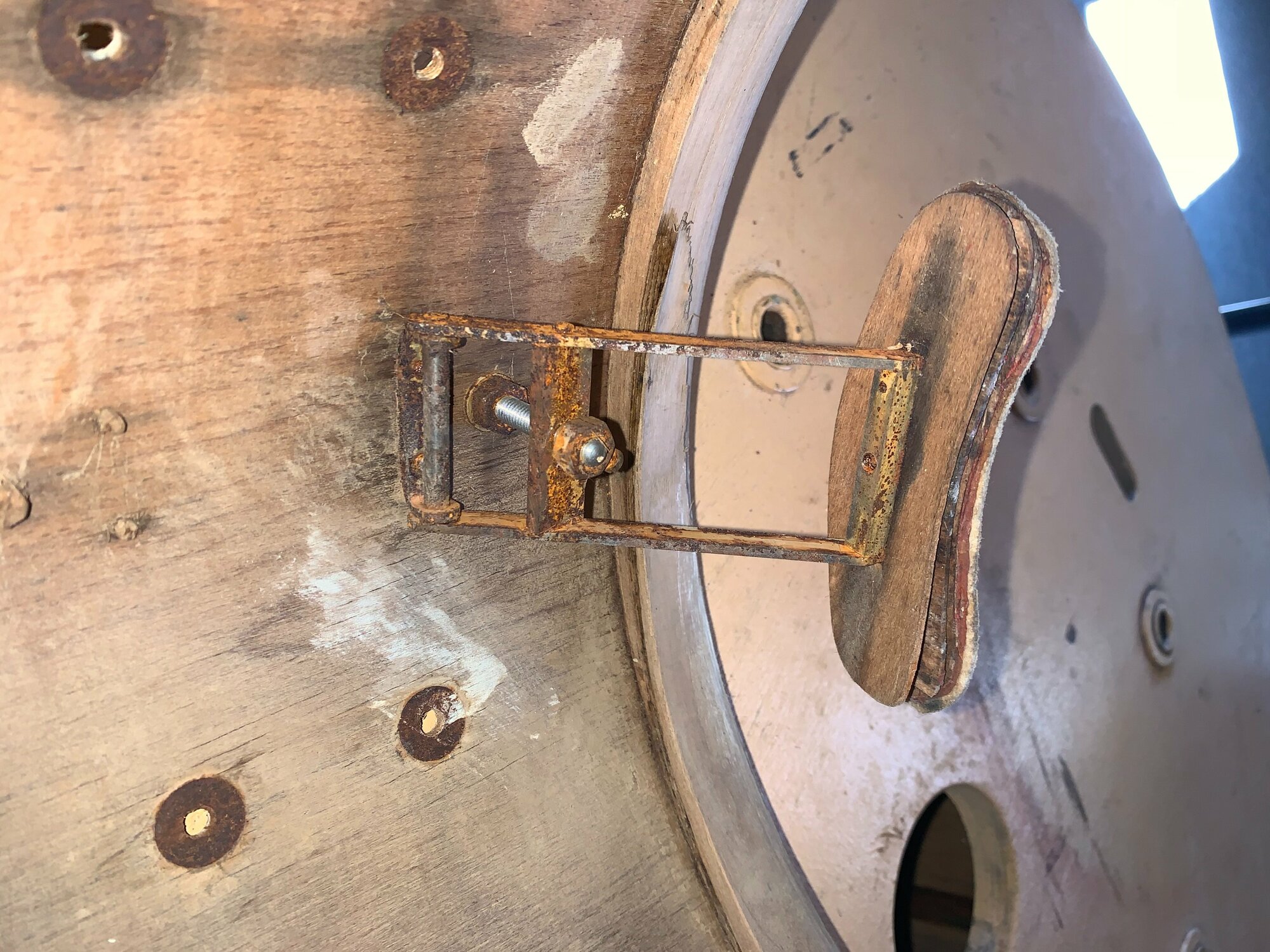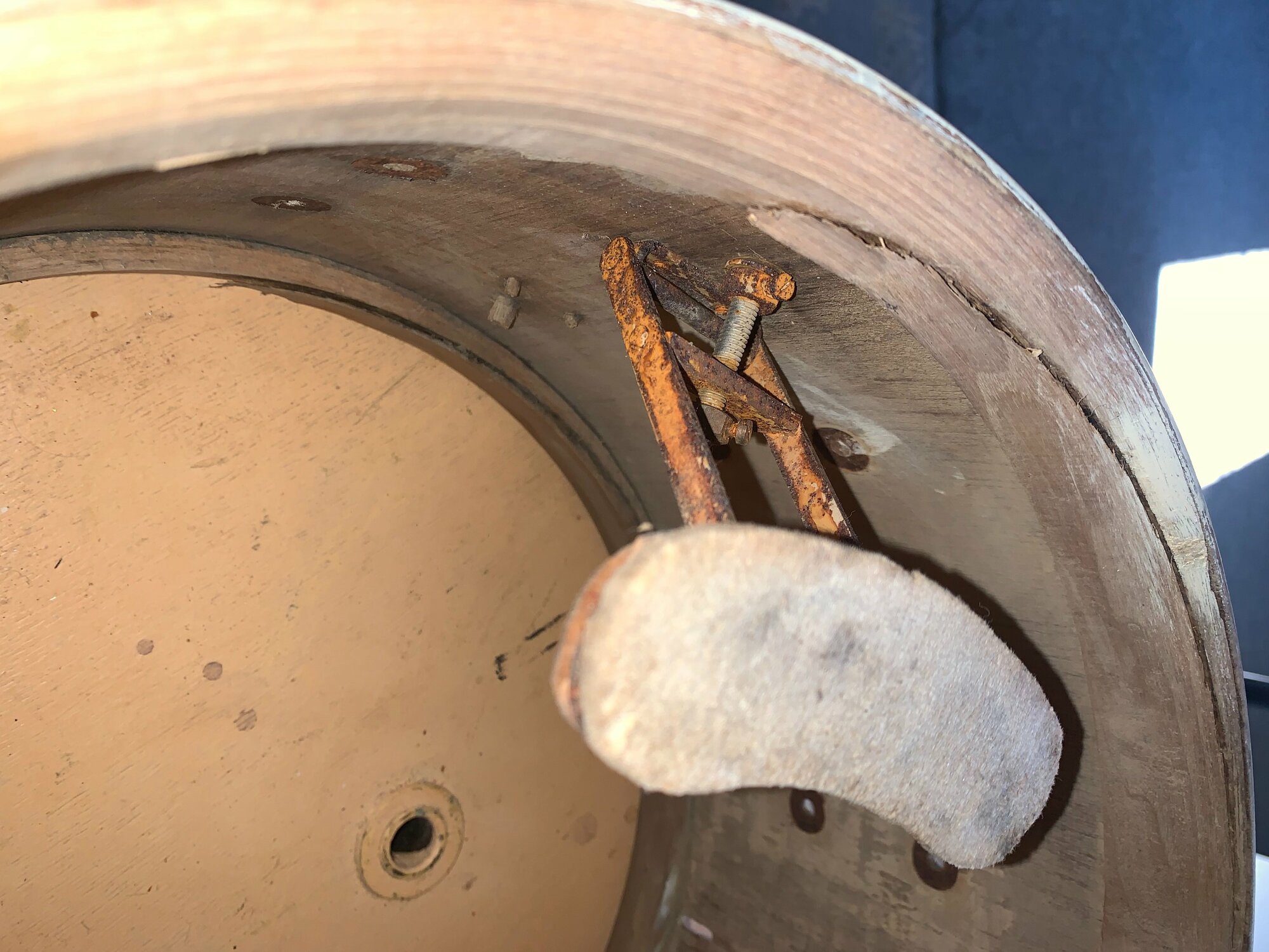 Bonjour à tous! Voilà mon premier post! Ca concerne une caisse claire Suisse, une Imperial Grand Luxe de 8" de profondeur. J'ai trouvé peu d'informations sur internet pour ce bestiau, j'imagine qu'elle date des années 60' vu que le diamètre est en métrique (************). Elle est munie de renforts de chanfreins taillés au couteau, flottants dans le fût actuellement, à recoller. Le bois me fait penser à de l'okoumé, type Asba mais je pense que vous pourrez m'éclairer plus. Les coquilles sont très belles, dans la masse. La peau qu'il y avait dessus est une RKB, du peuple Germanyque. Et je n'ai malheureusement pas son superbe déclencheur parallèle…