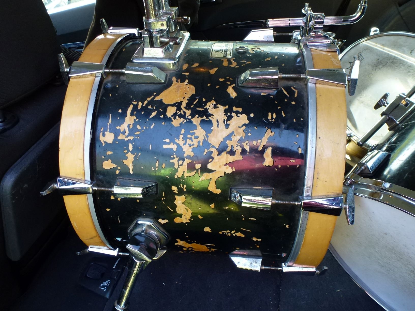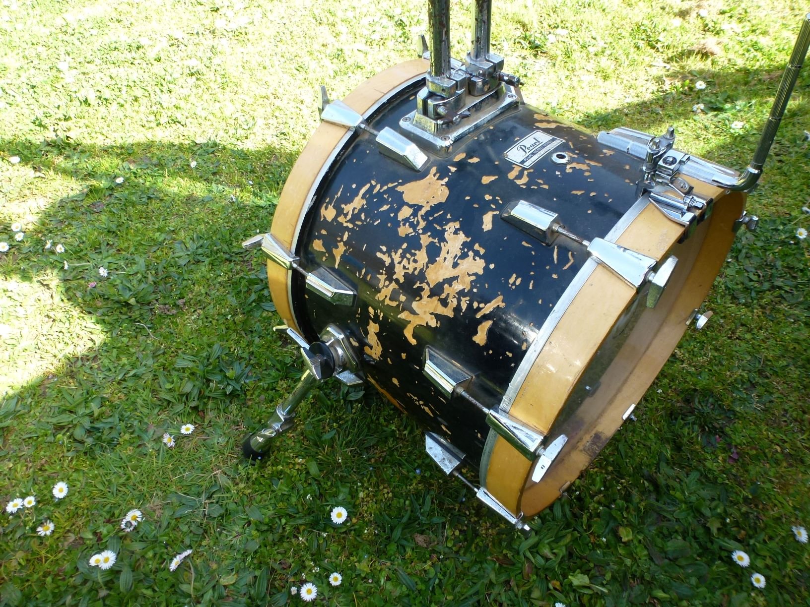 comme fait exprès un pote passe à la maison, Boss est "pro", possède une Sonor Signature Bubinga en 20" et une World noire en 18". cette World date (d'occase) de 83, n'a jamais connu la housse ni l'étui, est sa batterie principale à tel point qu'il ne se souvient même plus de la dernière fois ou il a sorti la Sonor; au bout de 38 ans d'utilisation quotidienne et d'autant de démontages/remontages, mis à part le côté esthétique "reliqué", elle est super fonctionnelle et ne part pas en couille. l'usure de la laque laisse apparaître un pli de bouleau bien verni avant l'application du piano black. Elle est tellement belle que je n'ai pas résisté à l'appel du casting: