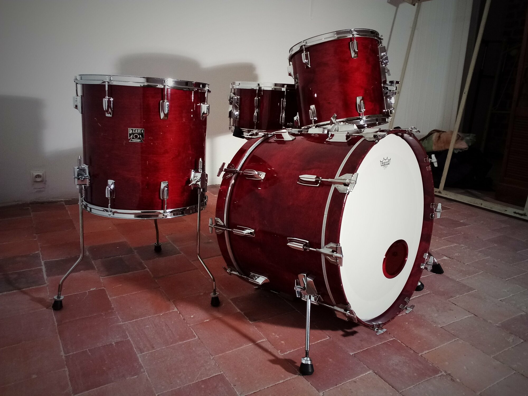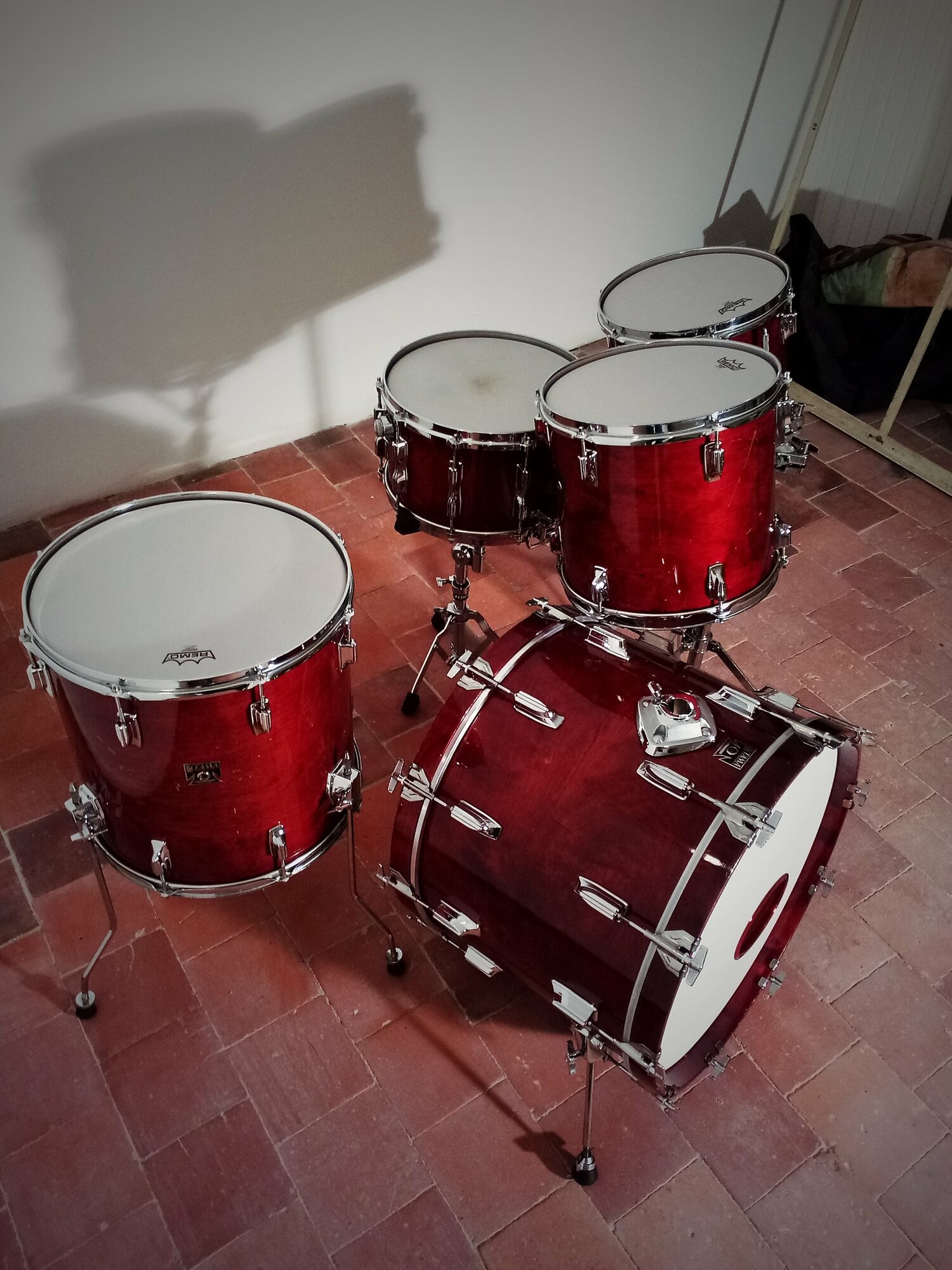 Tama Superstar Cherry Wine Xtras de 1983, en 22x16, 12x11, 13x12, 16x16 et la matching snare en 14x8...